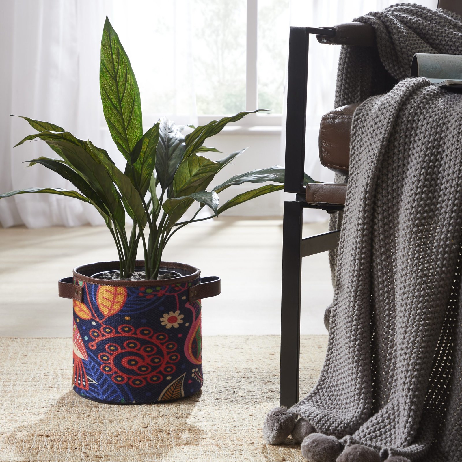 This planter is a stylish companion to adorn your living space with plants. The durrie look suplimation details makes it a worthy pick. It is lightweight, yet sturdy and durable.